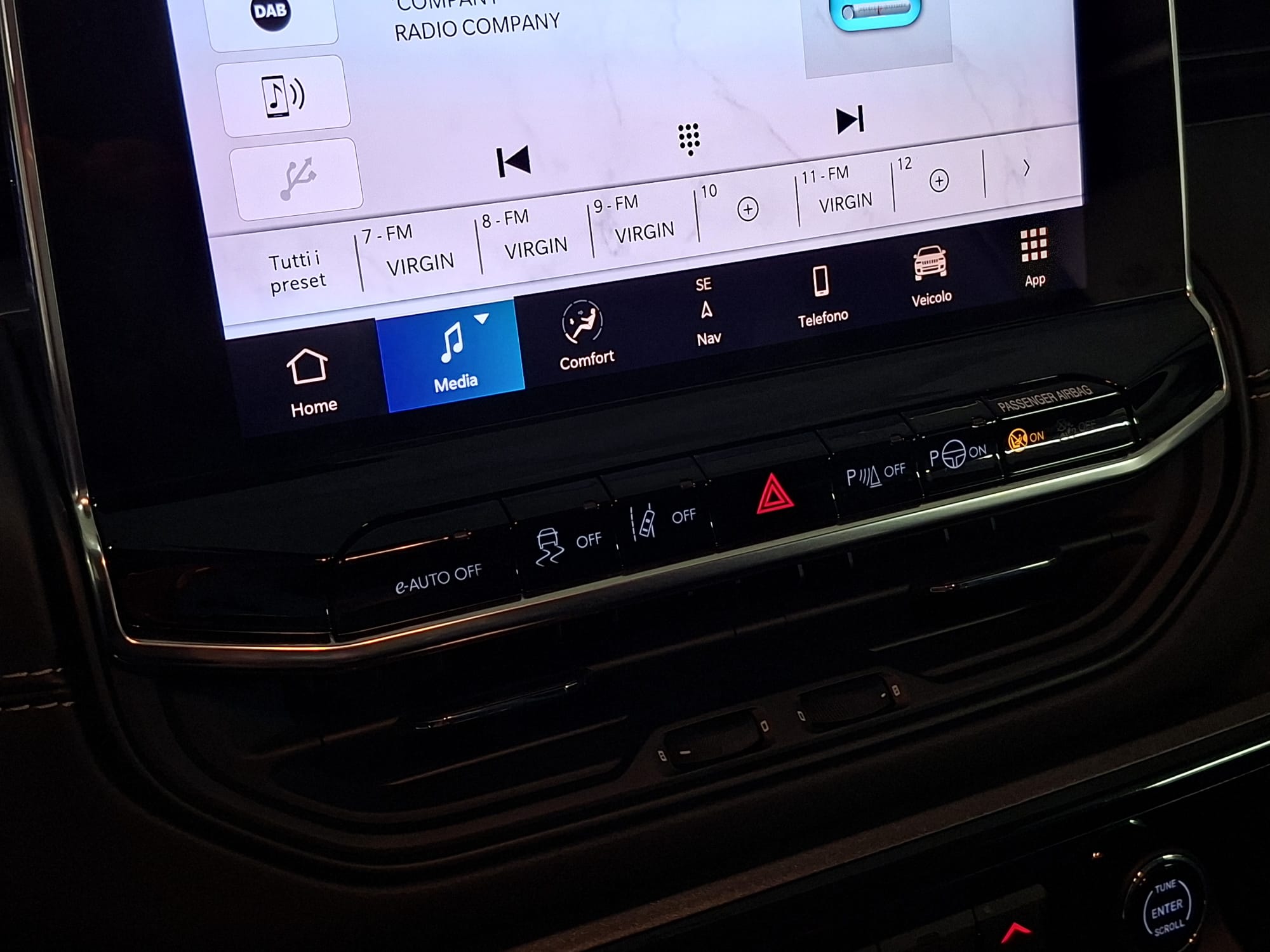 – Uconnect Radio NAV Touch da 10,1″ (Radio AM/FM con ricezione DAB e con comandi al volante + Navigatore satellitare con visualizzazione mappe in 3D + Display touchscreen a colori da 10,1″ + Presa USB Type-A e Presa USB Type-C, con funzione di ricarica, ubicate sulla consolle centrale anteriore + Presa USB Type-A e Presa USB Type-C, con funzione di ricarica, ubicate sulla consolle centrale, parte posteriore + Bluetooth + Comando vocale)