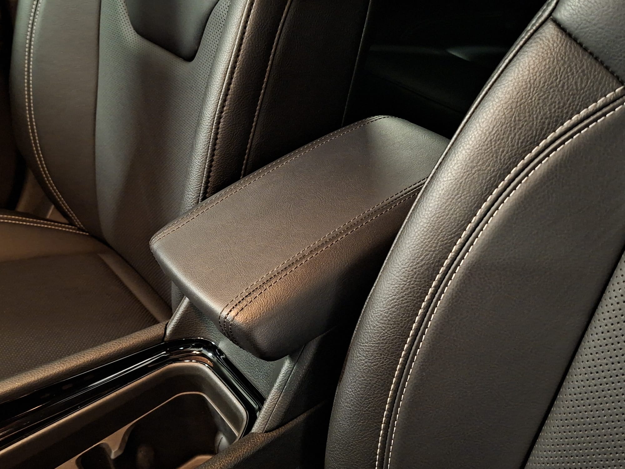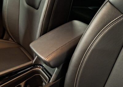 – Bracciolo centrale anteriore scorrevole, rivestito in Tecno-Vynil “”Black”” con cuciture a vista, con vano portaoggetti;
